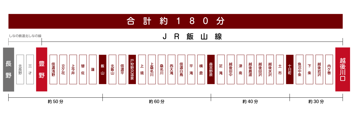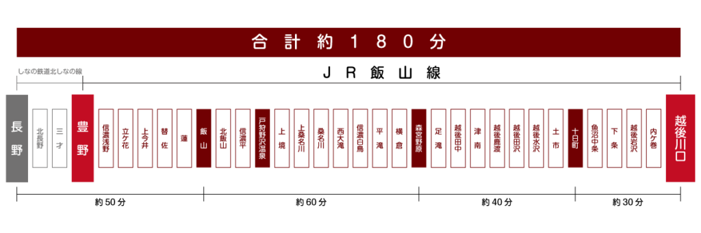 飯山線は起点である豊野駅(長野県)から越後川口駅(新潟県)まで、全長96.7kmを走ります。